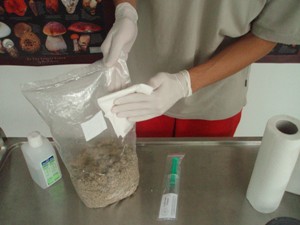 Bei diesem Arbeitsschritt muss besonders sauber und steril gearbeitet werden, damit die Körnerbrut nicht von Schimmelpilzen oder Bakterien befallen wird. Bitte vor Arbeitsbeginn die Hände und Arme gründlich waschen, Arbeitsfläche reinigen und desinfizieren. Nun legen Sie Haarnetz, Mundschutz und Latexhandschuhe an. Direkt vor Arbeitsbeginn werden nochmals die Hände desinfiziert.
